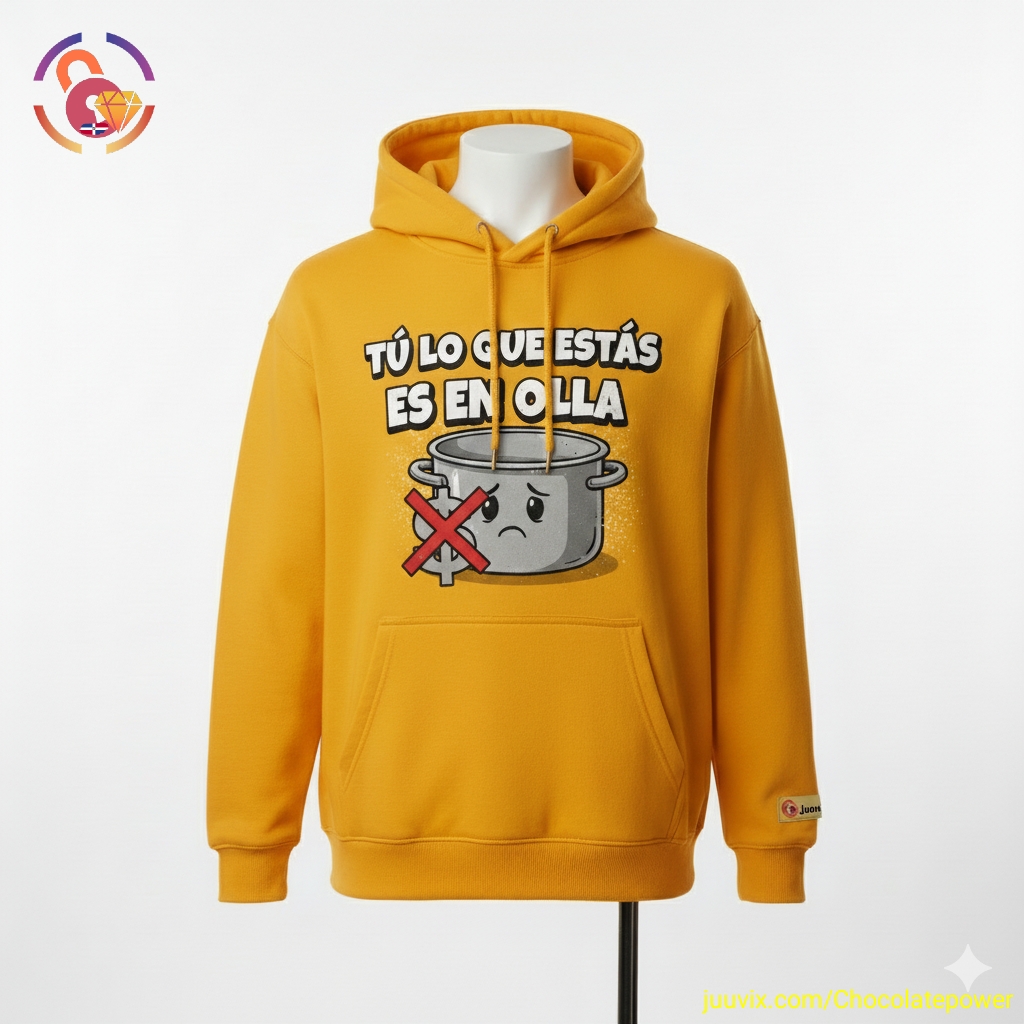 Demuestra tu estilo y sentido del humor dominicano con nuestra sudadera exclusiva Tú lo que estás es en Olla! Confeccionada con tela suave y cómoda, este hoodie amarillo vibrante es perfecto para esos días de relax o para añadir un toque de originalidad a tu atuendo casual. La frase icónica, un popular dominicanismo que significa estar sin dinero o en una situación económica apretada, se acompaña de un simpático diseño de olla triste tachada, evocando una sonrisa a quien lo vea. Ideal para regalar o para lucir tu orgullo caribeño con una pieza llena de autenticidad y personalidad. ¡Llévala con orgullo y sácale una sonrisa a la olla!